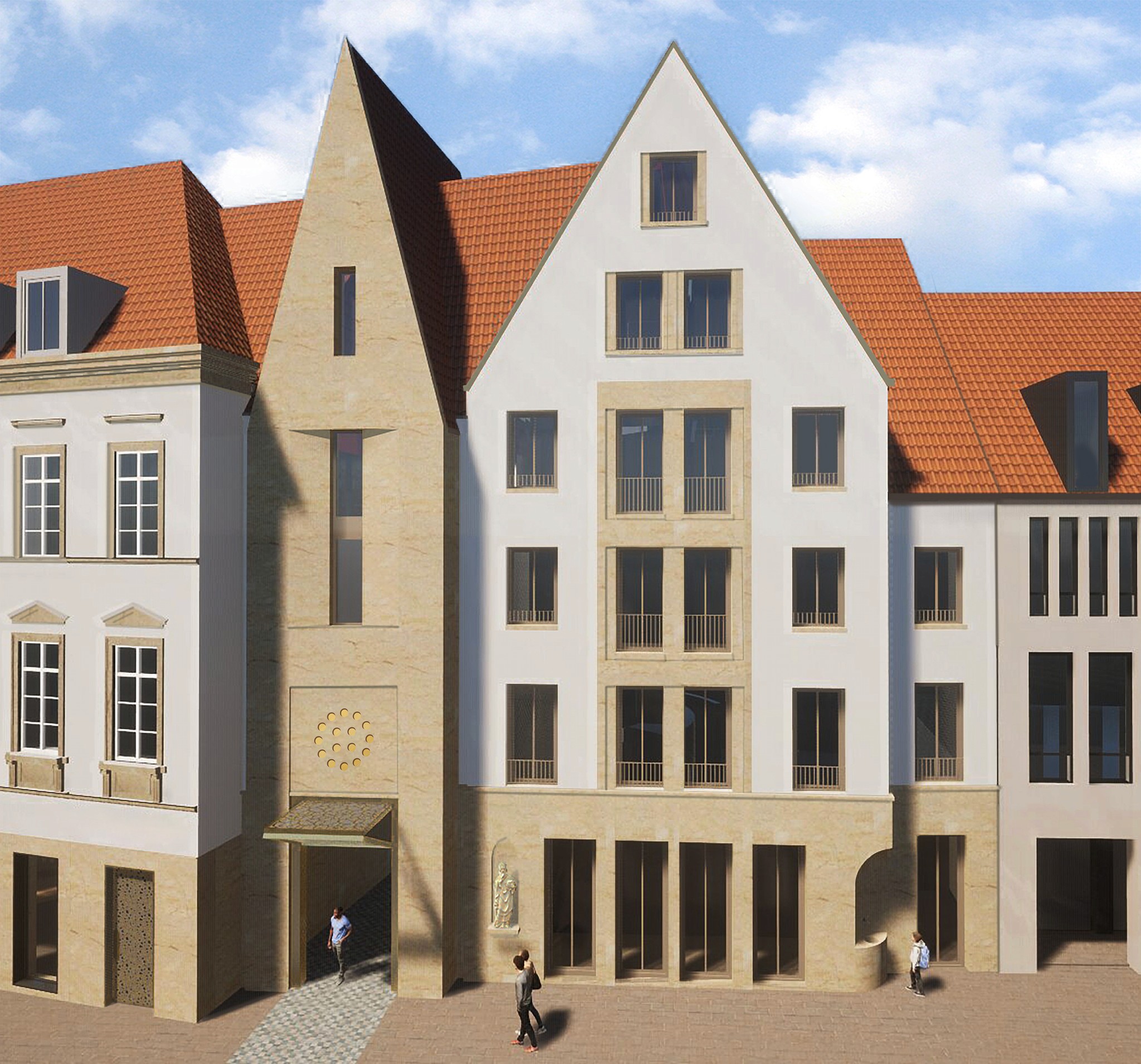 Im Zentrum der historischen Altstadt, direkt gegenüber der Stadtkirche St. Lamberti entsteht 75 Jahre nach dem Wiederaufbau ein Gebäude, welches in zeitgemäßer Architektursprache die historische städtebauliche Situation am Alten Steinweg wieder aufleben lässt. Innerhalb der historischen Parzellenstruktur entstehen ein steinernes Torhaus und ein prägnantes Giebelhaus. Die authentische Materialität der Altstadt, ausgewogenen Details und eine moderne Interpretation Münsteraner Giebelhäuser werden der Prominenz des Ortes gerecht. Der spektakuläre Eingang im Torhaus führt in das Museum „PAULUS“ und einen besonderen Innenhof.